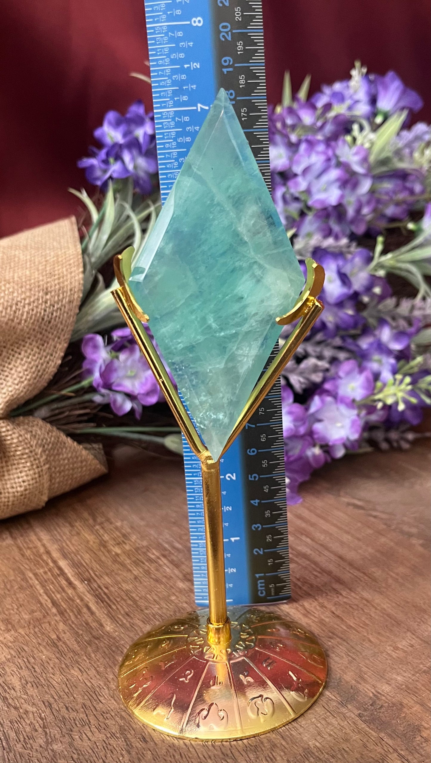 High Quality Green Fluorite Diamond on Gold Stand (sm)